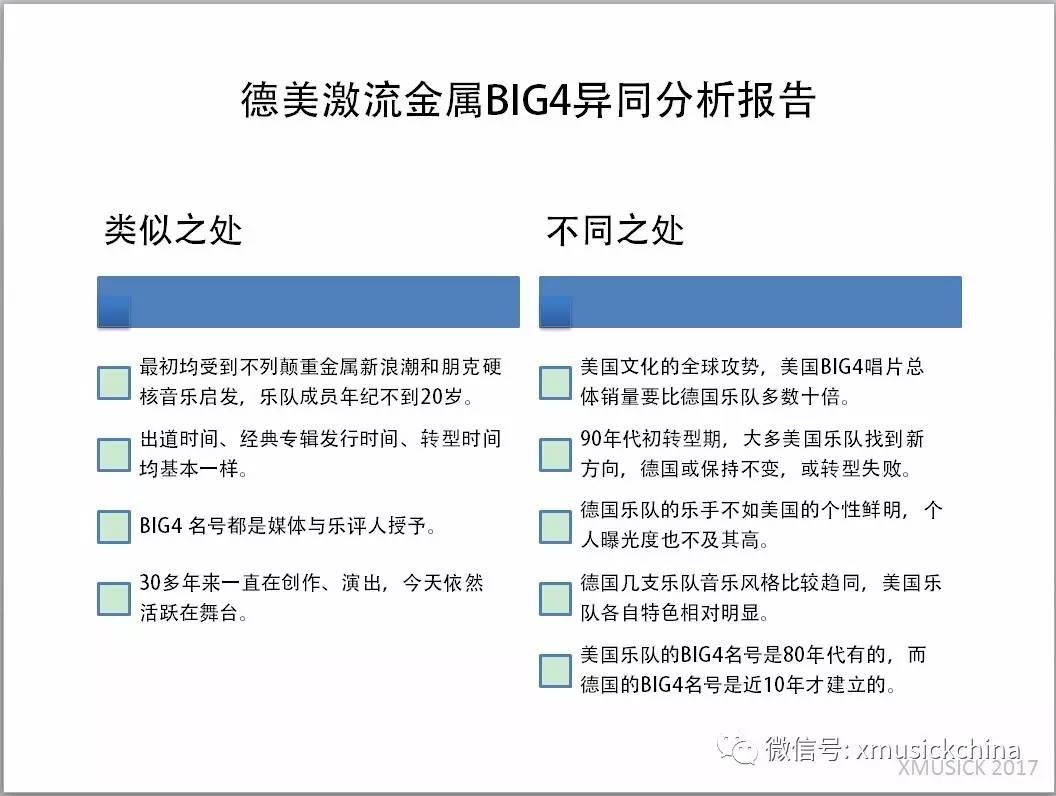 我们根据两个阵营中乐队各自特色,来对阵相应乐队,可以看到实力差距还是很悬殊的。德国 BIG4 从销量,知名度以及演出规模,基本只能和美国准一线激流实力相当,如 TESTAMENT、 EXODUS、OVERKILL 等。如果不是比拼硬指标,只是比较个人感受,那么各花入各眼,可能有异议。我们也只是从数据来分析。音乐本身个人感受是很难比对的。