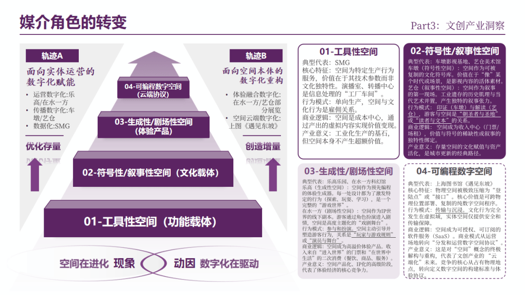 数字化对空间的影响分为赋能与重构两个层次:轨迹A通过技术优化,让传统实体空间更高效、更具体验感;轨迹B通过本质重构,创造出脱离物理束缚的数字空间新形态。两者共同推动文创产业的空间价值从“依附物理属性”向“聚焦内容与体验”跃迁,最终指向“空间液化与云端化”的未来——文化体验不再依赖固定场地,而是以标准化数字协议的形式,实现跨场景、跨地域的无限延伸。